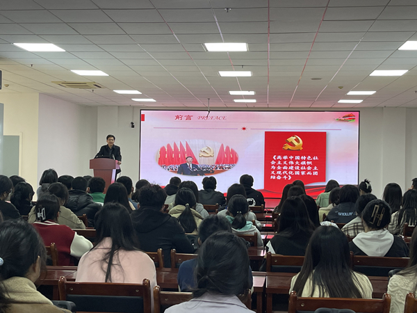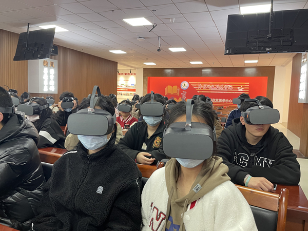 报告会开始之前,同学们在讲解教师王静的带领下,参观了思政虚拟仿真实训基地。驻足于结构巧妙、扣合严密、易拆难装的鲁班锁前,充分感受古代匠人的大智慧;穿过由图片和声光电组成思政文化长廊,对习近平新时代中国特色社会主义思想有了更加全面的认识和理解;通过沉浸式、交互式体验,身临其境地感受到高铁飞驰、蛟龙入海、神州飞天的科技震撼。随后,孙季勤从“党的二十大报告框架结构、报告中的新观点新思想、以青春之光绽放绚丽之花”三个方面对党的二十大精神进行了全面解读。围绕建设什么样的社会主义现代化强国、怎样建设社会主义现代化强国这个中国共产党的中心任务,孙季勤全面系统阐释了中国式现代化的领导力量、根本性质、鲜明特色、本质要求、战略安排和重大原则,让同学们深切感受到中国共产党的高瞻远瞩和责任担当。在讲到“两个务必”时,同学们通过VR眼镜仿佛来到了“新中国从这里走来”的革命圣地西柏坡,通过耳机聆听了毛泽东主席在七届二中全会上向全党发出“两个务必”的谆谆告诫。