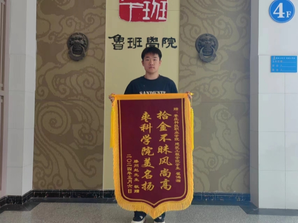 点滴小事有温情,细微善举传大爱。5月6日上午, 一面写有“拾金不昧风尚高,枣科学院美名扬”的锦旗送到了枣庄科技职业学院建筑工程学院,感谢2022级工程测量班翟鸿瀚同学拾金不昧、完璧归赵。建筑工程学院院长贾佳、党总支书记张兆青代表学院接收锦旗。