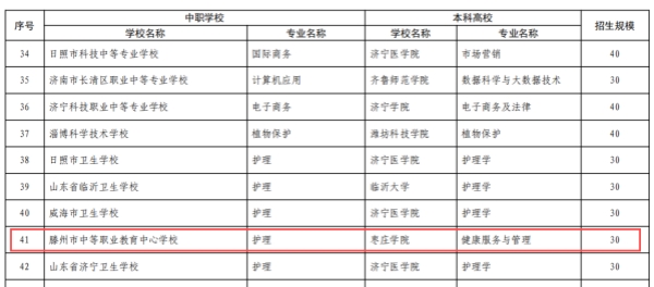 近日,山东省教育厅发布了《关于下达优化调整后职业院校与本科高校对口贯通分段培养试点任务的通知》,滕州市中等职业教育中心学校申报的护理专业“3+4”分段培养项目获得山东省教育厅批准,将对接枣庄学院健康服务与管理本科专业开展联合培养,于2025年开始招生。这表示,通过中考招生,录取为学校“3+4”贯通培养项目的学生,在学校学习3年经转段考试合格后,可直接转入枣庄学院本科学习,毕业后获全日制普通本科文凭。