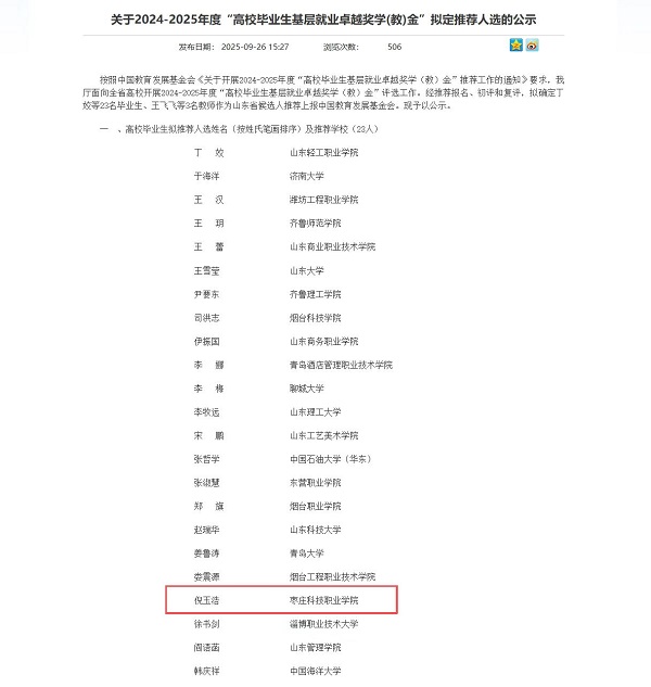 近日,山东省教育厅发布《关于2024-2025年度“高校毕业生基层就业卓越奖学(教)金”拟定推荐人选的公示》,经学校推荐、专家初评和复评,我院2018届机械设计与制造专业优秀毕业生倪玉浩成功入选,拟被推荐至中国教育发展基金会参评“高校毕业生基层就业卓越奖学金”。这一荣誉充分展现了我院毕业生扎根基层、担当奉献的精神风貌和新时代职业教育育人成果。