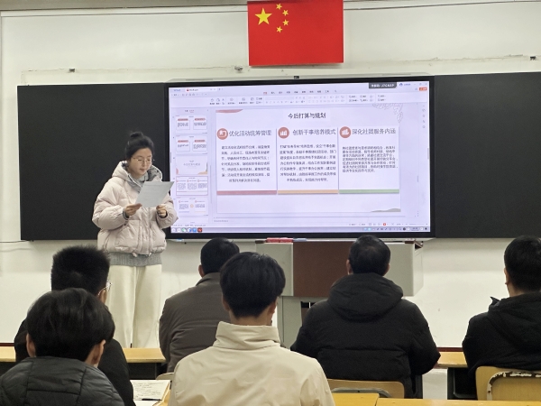 张朋以“以责任立身 以服务致远”为题,从风险防范、应急处置、责任落实等维度,强化学生安全意识与履职能力,并提出三点要求:一是牢记使命担当,提升履职本领。既要做严守规范、主动防范的安全“先行者”,也要做倾听需求、贴心服务的同学“贴心人”,助力学院工作高效有序推进;二是凝聚团队合力,强化协作效能。找准自身定位,主动补位互助,建立高效沟通机制,形成“心往一处想、劲往一处使”的工作格局;三是严守纪律底线,树立良好形象。坚持公平公正原则,以务实作风与扎实行动赢得同学认可,彰显学生干部良好风范。