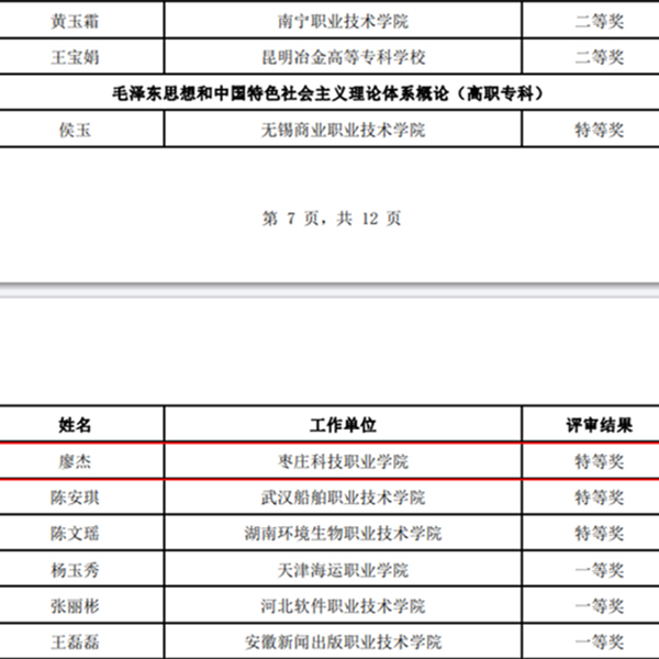 比赛开展以来,廖杰全力以赴、精心备战,在现场教学展示环节,凭借扎实的教学基本功、丰富的专业素养和良好的心理素质出色发挥、脱颖而出,荣获《毛泽东思想和中国特色社会主义理论体系概论》课程高职组特等奖,成为山东省所有高校获得特等奖的唯一选手。