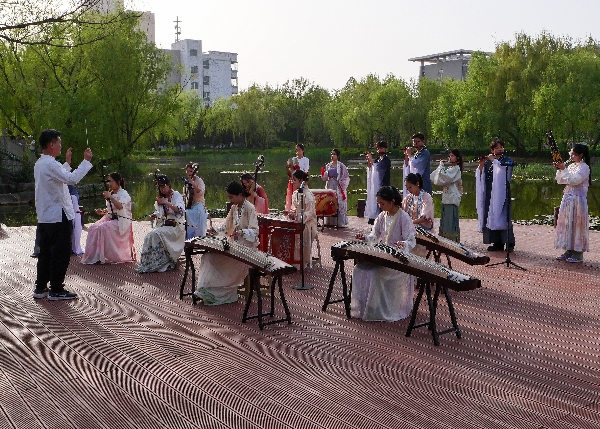 活动伊始,现场氛围热烈,精彩节目轮番上演。大学生艺术团带来的男女声合唱,将《凉凉》《不染》等古风歌曲演绎得婉转动人,而在《敕勒歌》中,他们的声部配合默契,层次分明,赢得阵阵掌声。随后,传统民乐合奏奏响,古筝、二胡、竹笛等乐器交织出悠扬旋律,让现场观众沉浸在传统音乐的魅力之中。