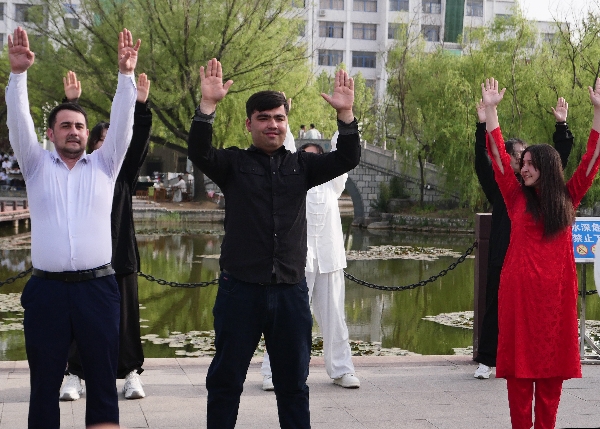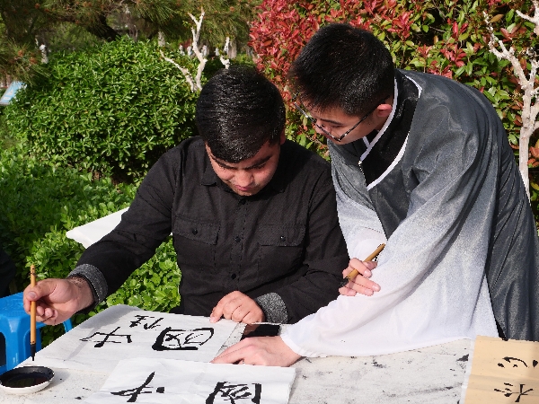 活动现场,各类传统文化体验区亮点纷呈。在书画体验区,三希堂书法社的成员现场挥毫泼墨,展示书法艺术的魅力。留学生们围在一旁,认真观摩,不时发出赞叹,他们还在书法社成员的鼓励下,拿起毛笔,写下简单的汉字。棋艺互动区,“社会主义核心价值观”联棋社组织的象棋和围棋活动,吸引了众多同学参与对弈。此外,矜悠汉服社带来的国风舞蹈《落》,舞者们身着汉服、唐装,衣袂飘飘,仿佛穿越时空,展现了古代服饰的独特韵味。中医强身八段锦社团带来的八段锦表演,动作舒展优美,一招一式尽显中国传统健身文化的魅力。特别值得一提的是,活动邀请了柳琴戏非遗传承人赵杨杨老师进行表演,其悠扬的唱腔和生动的表演让同学们大开眼界。塔吉克斯坦留学生们也沉浸其中,感受到了中国传统戏曲的独特魅力。