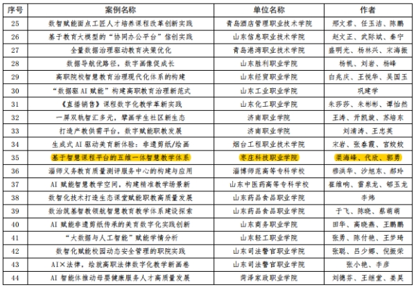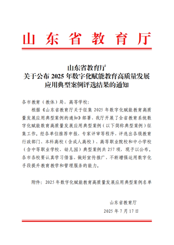 近日,山东省教育厅下发《关于公布2025年数字化赋能教育高质量发展应用典型案例评选结果的通知》,我校推荐的《基于智慧课程平台的五维一体智慧教学体系》案例成功入选。