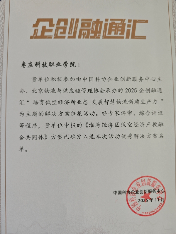 11月12日,“企创融通汇——2025低空经济智慧物流主题产业大会”在北京隆重召开。本次大会在中国科协企业创新服务中心指导下,由北京物流与供应链管理协会、北京物资学院、互联网采购供应链专委会、北京中关村留学人员创业园协会等多家权威机构联合主办。会上,由学校提报的《淮海经济区低空经济产教融合共同体》方案,被大会确认为“优秀解决方案”。