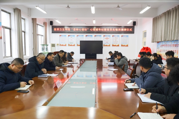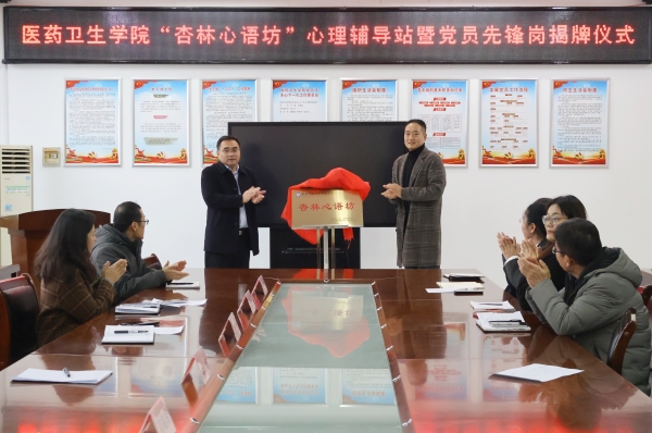 为落实立德树人根本任务、完善“五育并举”育人体系,聚焦学生成长需求、深耕心理健康教育工作实践,12月22日下午,医药卫生学院隆重举行“杏林心语坊”心理辅导站暨“党员先锋岗”揭牌仪式。学校党委委员、组织人事部部长秦峰,学生工作处处长薛涛,医药卫生学院领导班子成员,“杏林心语坊”全体心理任课教师、辅导员共同见证这一重要时刻。仪式由医药卫生学院党总支书记于莉主持。