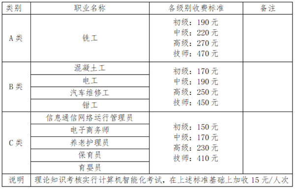 职业技能等级认定考核收费参照《山东省物价局山东省财政厅关于规范职业技能鉴定考试收费有关问题的复函》(鲁价费函〔2016〕85号)制订,具体如下: