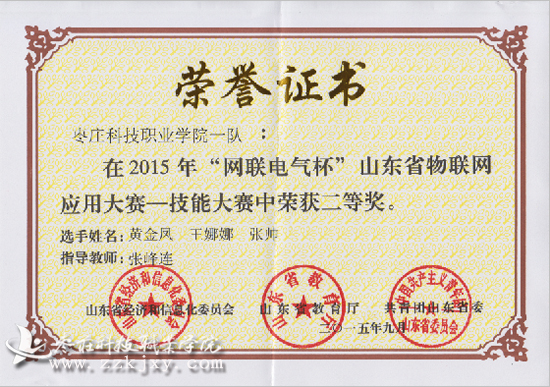 本站讯(通讯员 翟东清)9月22日至23日,由山东省经济和信息化委员会、山东省教育厅、共青团山东省委主办的2015年“网联电气杯”山东省物联网应用大赛(技能大赛)在省会济南成功举行,共有24支代表队参加了比赛。经过激烈角逐,我院信息工程系选派的2支参赛队伍均取得优异成绩,其中一队(选手:张帅、黄金凤、王娜娜,指导教师:张峰连)获得全省二等奖,二队(选手:王淑慧、王彩红、张苗,指导教师:翟东清)获得三等奖。