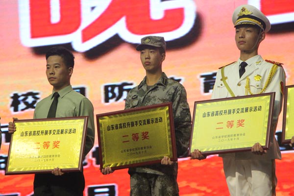 成绩的取得体现了学院学子能吃苦、善创新、敢担当、乐奉献的特质,更展现了学院国旗仪仗队全体队员的新时代大学生风采,也让全省本科及高职院校对学院刮目相看,标志着学院在标准化升旗建设和国旗文化建设、爱国主义教育方面,走在了全省前列。带队指导老师苗壮介绍,学院国旗仪仗队成立3年,多次到各市直学校和机关单位组织升旗仪式。在平时训练中,全体队员坚毅顽强,高标准严要求,生活中团结互助,他们是真正军人精神的继承人。这次国旗仪仗队走出校门,将军工传人的精神风貌和青春风采展现在齐鲁大地,赢得了荣誉,收获了成长。