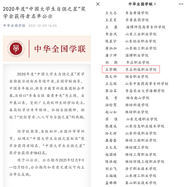 近日,由共青团中央、全国学联等联合开展的2020年度“中国大学生自强之星”评选结果揭晓,枣庄科技职业学院信息工程学院2019级软件技术班王学鹏荣获“中国大学生自强之星”称号。