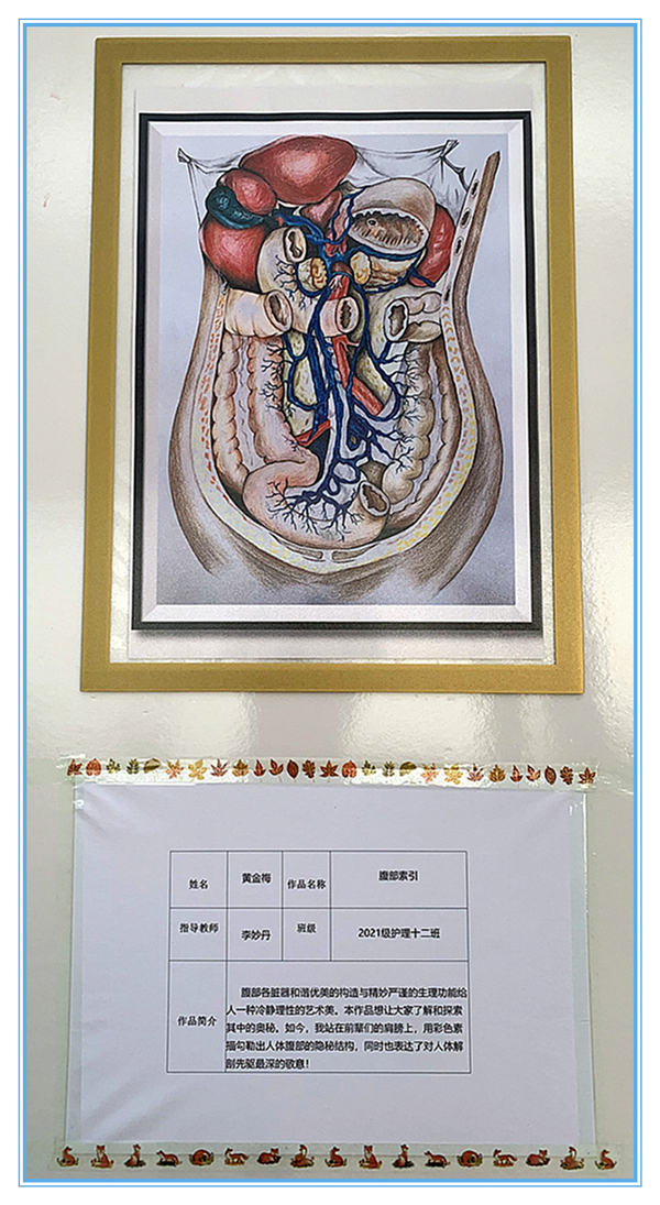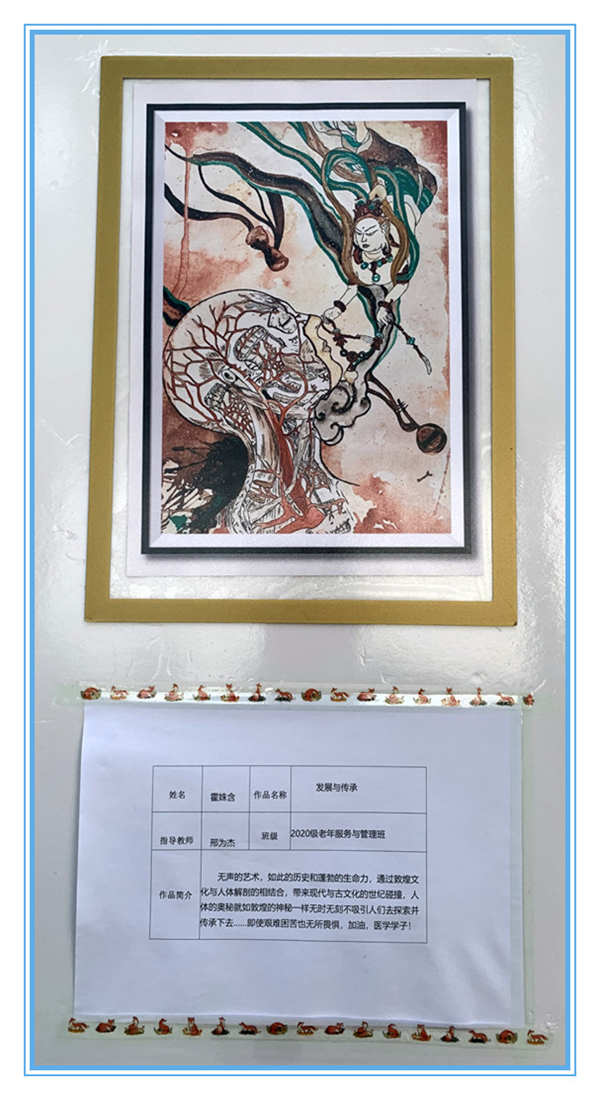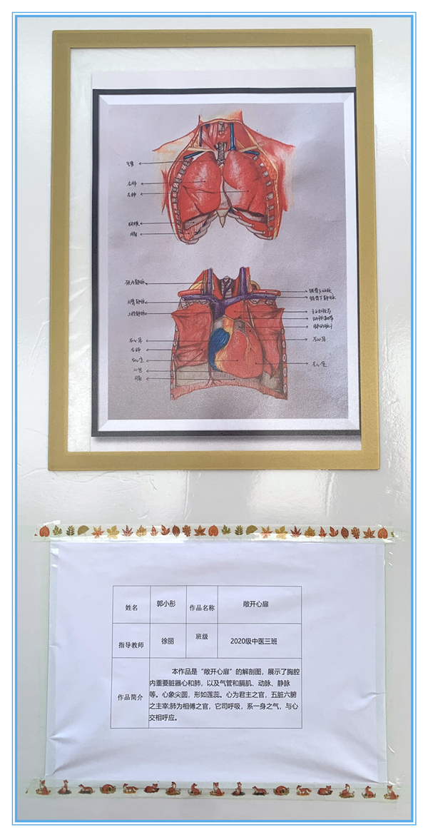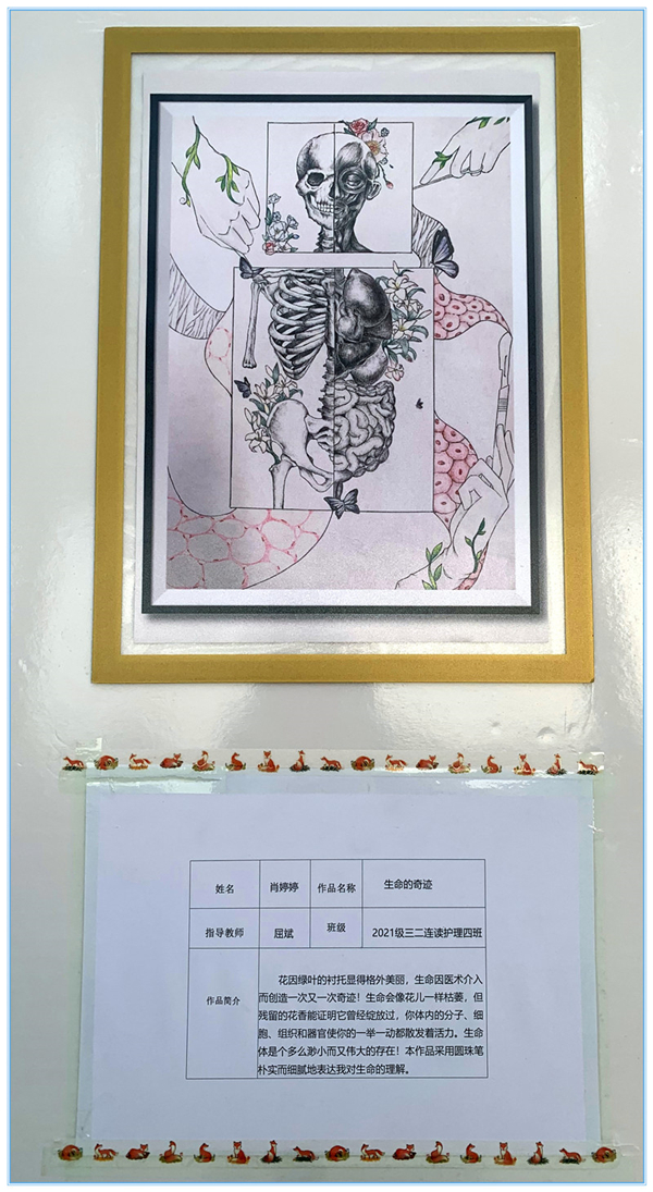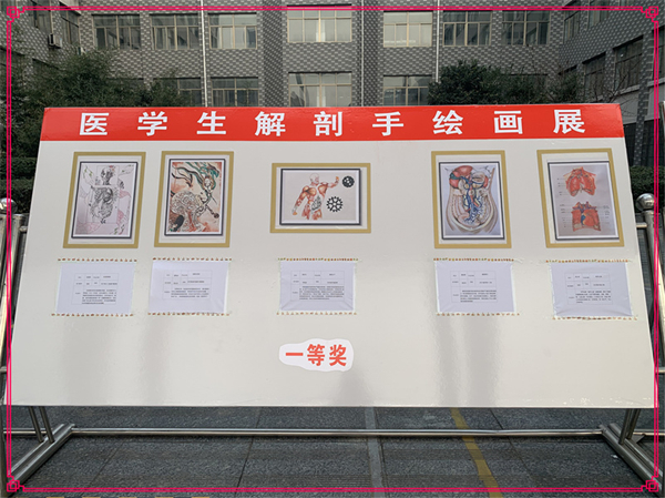 在山东省卫生健康行指委正式公布获奖结果后,基础医学教研室筹备已久的画展正式拉开帷幕。本次画展中,学院展出获得学院一、二等奖的十五幅作品。展期两周。每幅画作兼具科学精神,又有艺术韵味,作品文字更是神采飞扬、惊心动魄,映射了医学生关注社会发展的人文情怀,又彰显了作品的哲学高度,兼具社会性与哲学性,使观赏者在感叹人体器官神秘的同时,不禁感慨大自然的奇妙,敬畏生命之情油然而生。